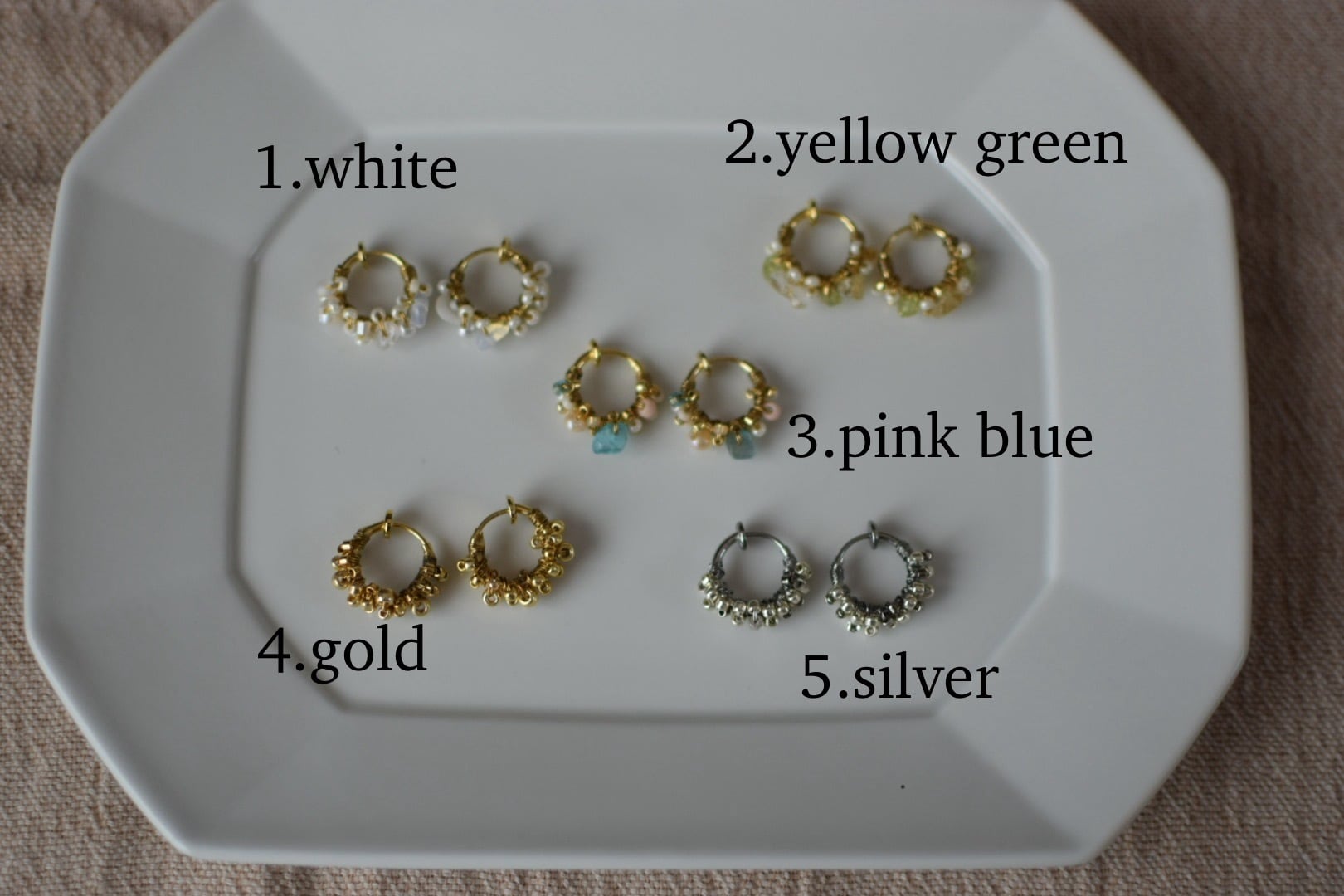 粒ビーズをたくさん使用し、普段使いがしやすいシンプルなデザインに仕上げました。
