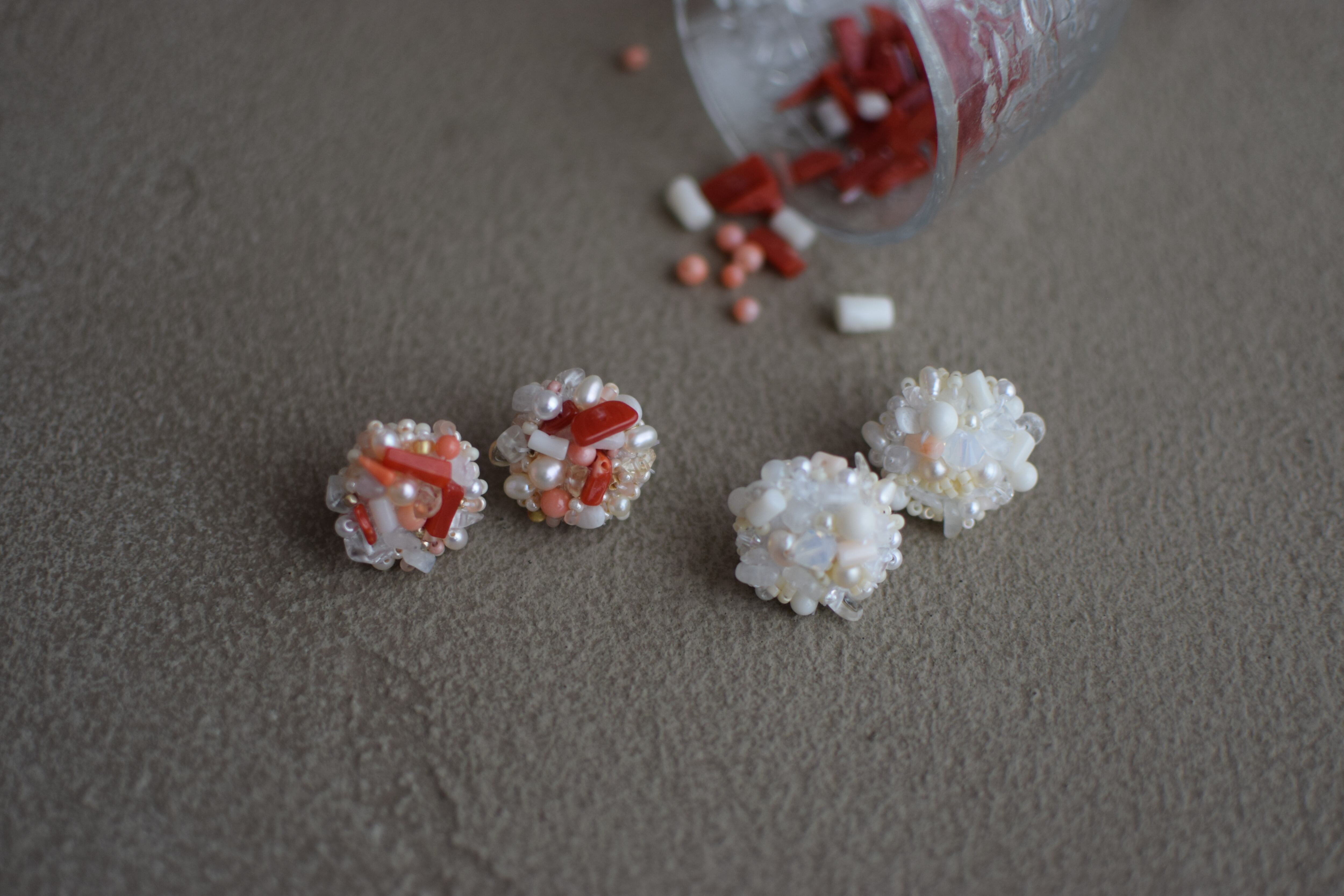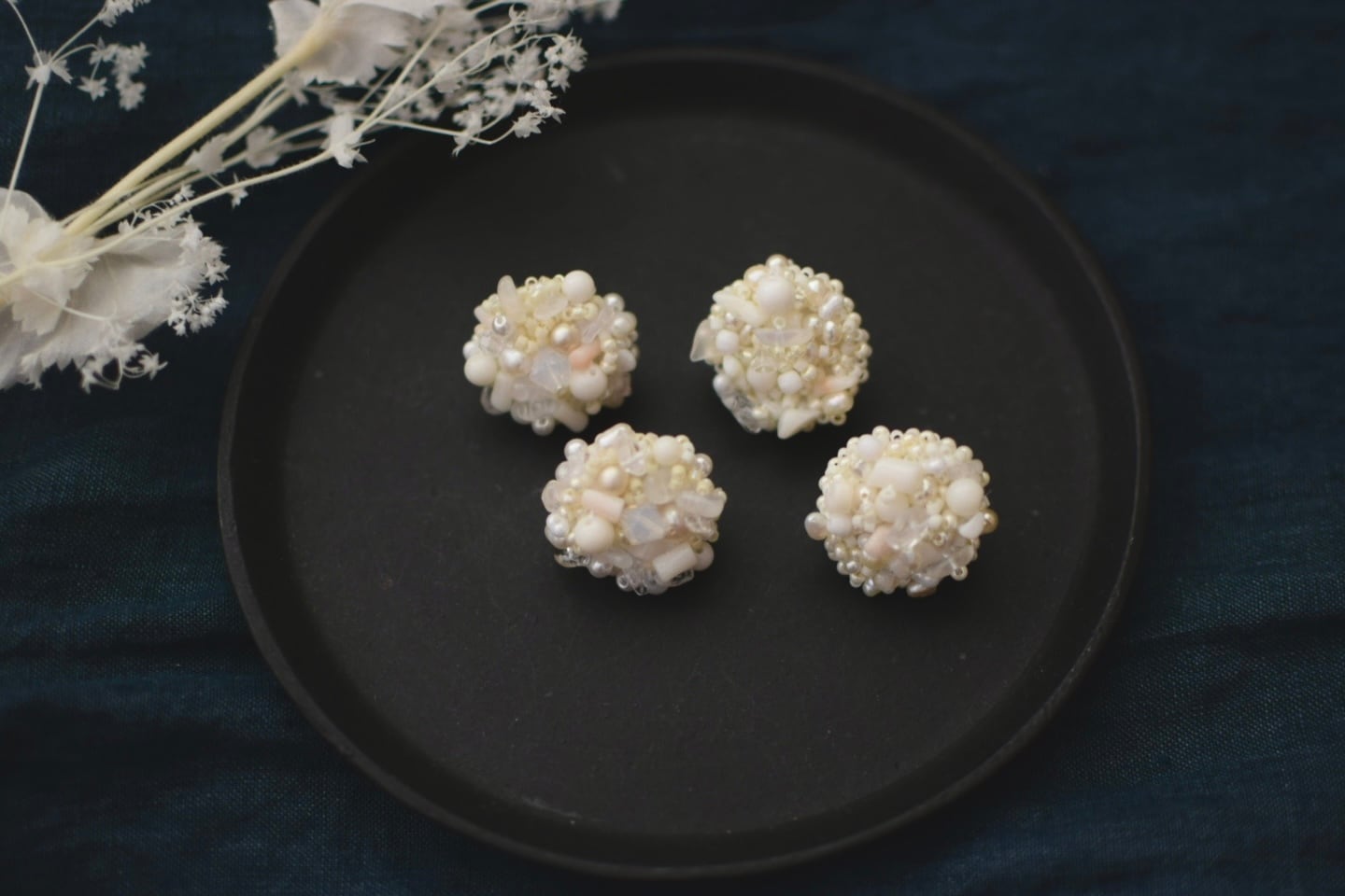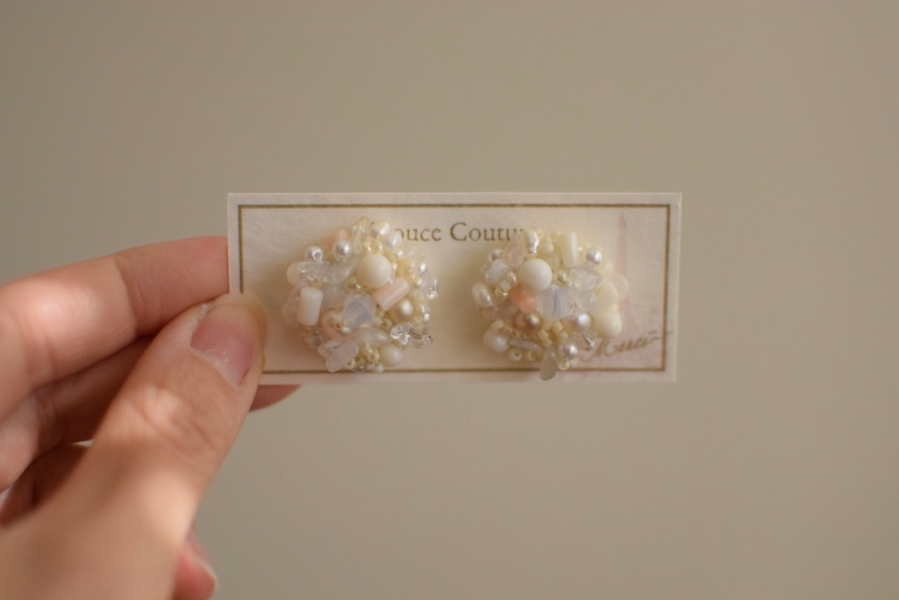 ピアス/イヤリング/ビーズ/刺繍/春/夏/秋/冬/オールシーズン/結婚式/ウエディング/パーティー/お呼ばれ/プレゼント/キラキラ/ヴィンテージ/おしゃれ/シンプル/パール/コットンパール/手刺繍/つぶつぶ/金属アレルギー対応/ステンレス金具/おおぶり/ビーズ刺繍/アンティーク/バレンタイン/ホワイトデー/入学式/卒業式/卒園式